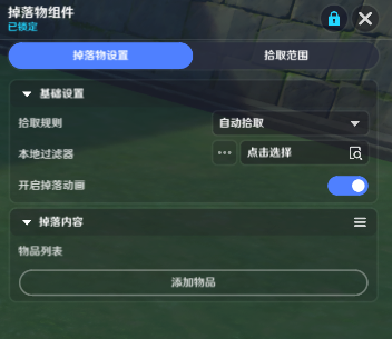 掉落内容:支持在组件内配置一个掉落物所包含虚拟物品的字典,当掉落物被直接布设在场景内,通过元件实体创生时,掉落物将包含组件内所配置的所有虚拟物品。而当掉落物通过战利品形式创建时,则只包含实际掉落的虚拟物品,组件内的默认数据会被覆盖