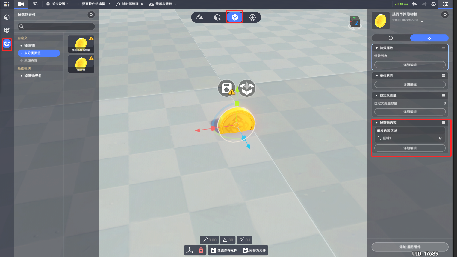 在进行上述虚拟物品的模板编辑时,都需要关联一个掉落物元件,如果没有关联,则掉落逻辑会被屏蔽