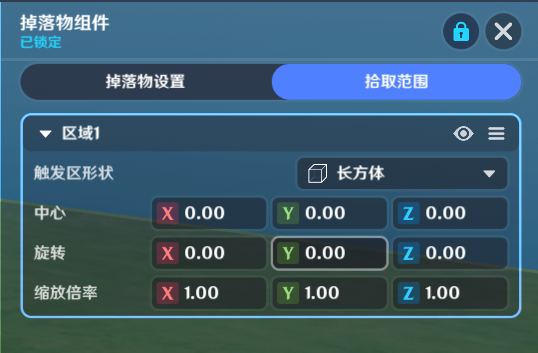 拾取范围:定义玩家可拾取掉落物的范围,使用通用的形状定义结构,支持长方体,球体,胶囊体三种基本形状