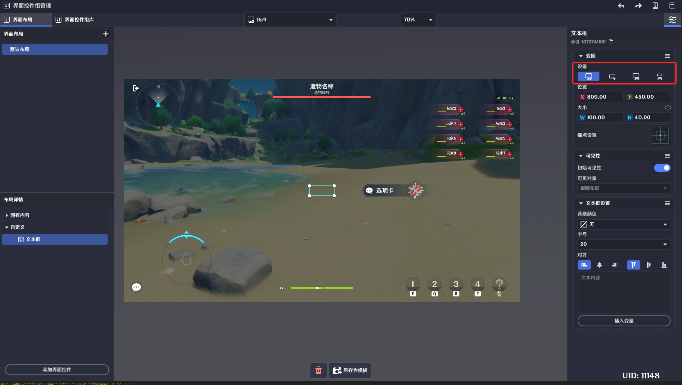 由于不同设备上的分辨率/按钮排布等界面布局差异较大,如果需要制作PC端/移动端/主机端都可以游玩的关卡,则需要调整控件在不同设备上的位置、大小、锚点
